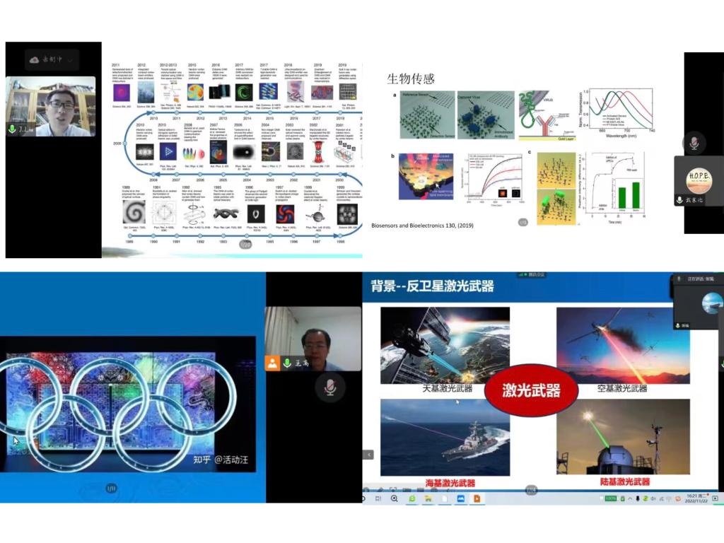 四位嘉宾分别以“复杂环境光电信息获取技术”“新型光电成像技术与应用”“纳米光学及生物传感”“光为伴”四个主题作了精彩的学术报告。讲座中,几位老师都不约而同地介绍了光电专业的发展历程,并对专业的学习目标、学术前沿、未来前景提出了个人见解。他们讲到,光学专业在整个科技发展史中为人类做出了巨大贡献,在金属材料应用、超分辨成像、生物传感、量子领域、航空航天、激光加工等领域都有应用,涉猎领域广,发展口径宽;光学专业是国家的军事发展和科技进步的中流砥柱,是面向世界科技前沿、面向经济主战场、面向国家重大需求、面向人民生命健康的基础专业。最后,老师们表示,欢迎同学们来到光电世界,期待大家在光电领域深耕不辍、发热发光。