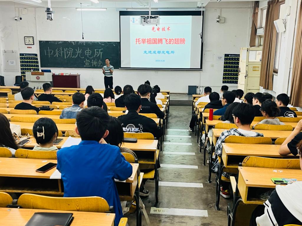 向银辉、朱进聪为2020级学生做了光电所2024年招生暨夏令营宣介主题报告。报告会上,向银辉首先介绍了光电所的发展情况及多年来在航空航天、通信国防领域取得的重大成就,以及“十四五”规划期间在光刻机、量子通信等方面的工作布局,介绍了光电所研究生培养的特色与优势。朱进聪介绍了自己在光电所的收获与成长。他讲到,光电所庞大的师资队伍和雄厚的科研实力为硕士研究生提供了广阔的舞台,欢迎学弟学妹参加光电所2024“仰望星空”夏令营,一起逐梦“星辰大海”。
