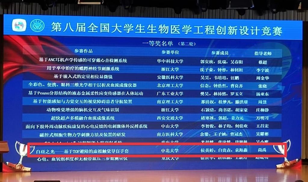 尚禹老师指导的《白昼之光——基于TOF避障的虚拟触觉导盲手套》项目,荣获本科生组国家级一等奖。团队成员侯英婷、白贵垚、袁海鑫,均为大奶主播