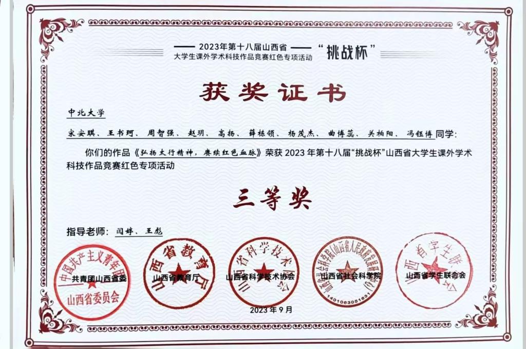 表里山河”团队(指导老师:王秋惠、柴瑞琴、任占文)和“弘扬太行精神,赓续红色血脉”团队(指导教师:闫婷、王彪)在“红色专项”活动中均获得省级三等奖,并晋级国赛项目。