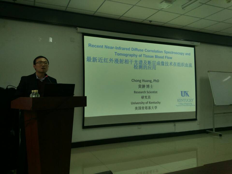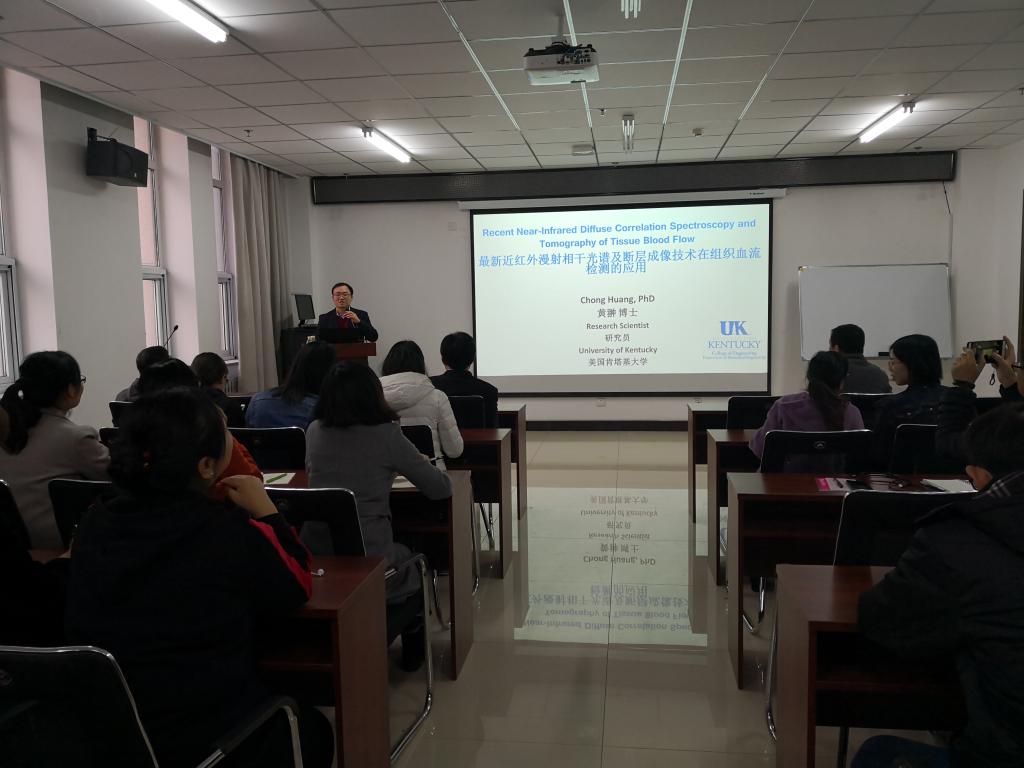 在报告中黄翀博士重点介绍了基于近红外漫射光相关原理和激光散斑原理的4类血流光谱及成像技术,同时也讲解了这些技术在肿瘤手术移植、乳腺癌和动物脑中风模型的应用,对这些技术的临床意义进行了详细的讲解,使参加讲座的师生受益匪浅。会后大家踊跃提问,对于每个问题黄翀博士都进行了耐心细致的解答。
