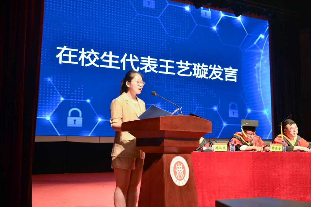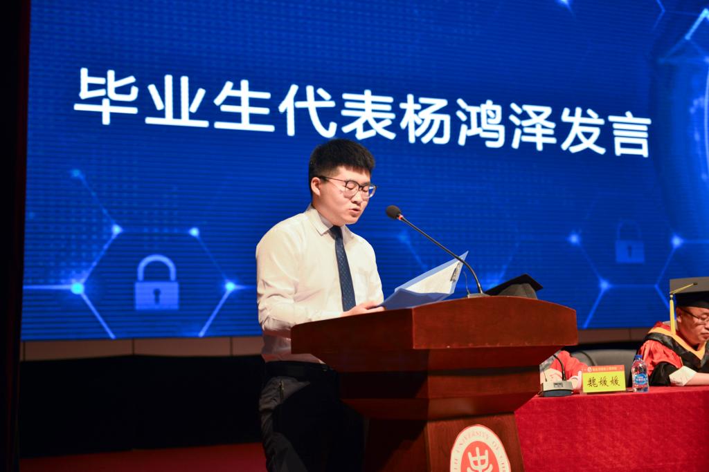 接着,校长奖章获得者保送至复旦大学的15050442班胡朝煜同学的母亲郭瑞英女士作为家长代表发言,代表家长表达了对学校辛勤培育的感谢和对学校良好发展的祝愿。教师代表李凯希望同学们勤奋学习、积极工作,在平凡的工作岗位上建功立业。毕业生代表杨鸿泽同学深切表达了对大奶主播领导、老师的感激之情和对同学、朋友的不舍之情,一句“再见,同学;你好,校友”,让无数同学潸然泪下。在校生代表王艺璇同学表示将继承学长、学姐们的精神,报效祖国,回报社会,同时也祝愿学长、学姐们在日后事业中鹏程万里,前程似锦。