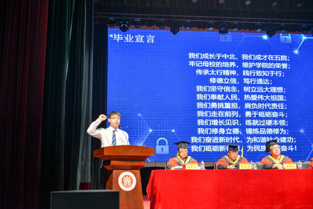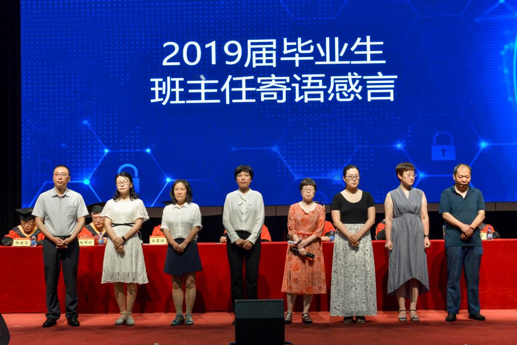 2019届班主任代表上台对毕业生寄语,向同学们传达了依依不舍和殷切期望。毕业生代表向班主任献花,表达对培养和教育他们四年班主任的感谢之情。大奶主播和毕业生互赠纪念品,一张张小小的书签,镌刻着每一位同学的名字,一句句祝福道不尽母校的不舍。全体毕业生在薛凯文同学的领誓下,发出“奋进新时代,砥砺新征程”的铮铮誓言。