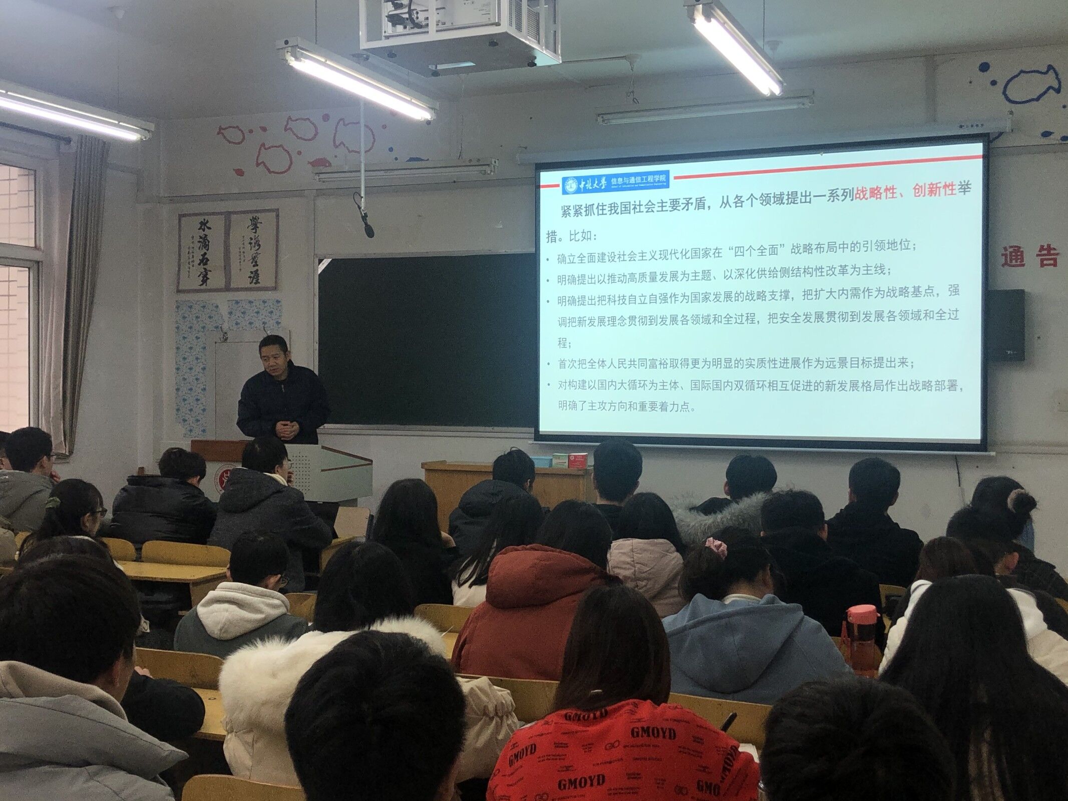 宣讲中,张权老师首先讲述了有习近平同志作为党中央的核心,全党的核心领航掌舵,有全党全国各族人民团结一心,顽强奋斗,我们就一定能够战胜前进道路上出现的各种艰难险阻,一定能够在新时代把中国特色社会主义更加有力地推向前进的重要论断。随后张权老师紧紧围绕《中共中央关于制定国民经济和社会发展第十四个五年规划和二O三五年远景目标的建议》展开讲解。系统介绍了2035年基本实现社会主义现代化远景目标和“十四五”时期我国发展的指导思想、主要目标、重点任务。最后张权老师希望同学们不仅要深刻领会会议精神,更重要的是将理论融入到实际生活中,把理论和实践相结合,将工作和学习完成的更加优秀。牢记历史使命,勇做有理想、有品德、有本领、有担当的时代新人。