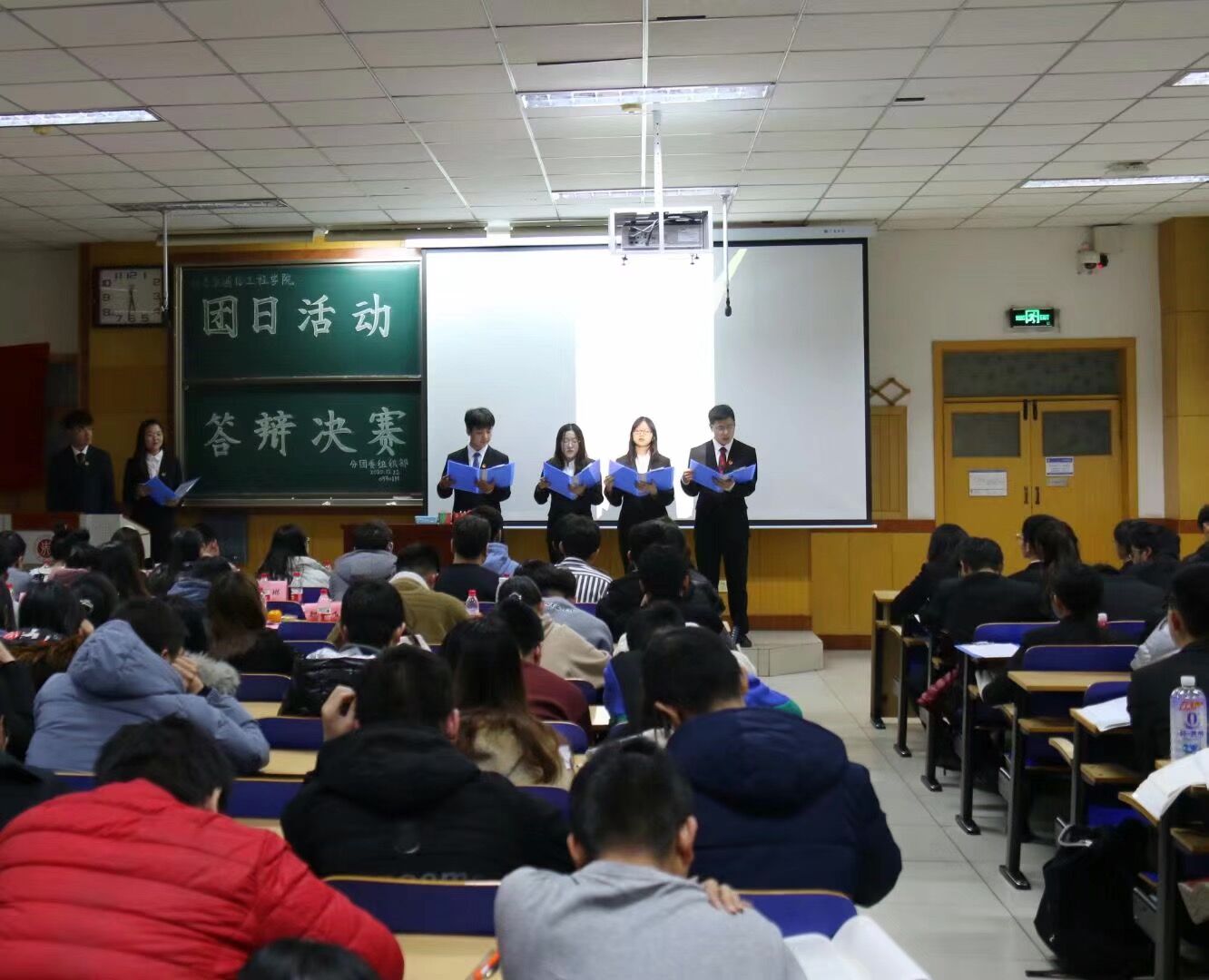 经过初赛的选拔,共十个团支部晋级决赛。在庄严的团歌声中,团日活动答辩正式拉开帷幕。在主持人介绍答辩规则后,各团支部就支部建设、活动内容、社会影响等方面内容依次进行答辩。答辩场上,各支部展示着精心制作的答辩内容,大家集思广益,采用多样的表现形式,力争在决赛场上脱颖而出。合唱、朗诵、播放视频等多种形式的表演更将会场气氛推向高潮。经过激烈的角逐,20050402团支部摘得桂冠!并由院团委书记闫婷为获奖团支部颁发荣誉证书。