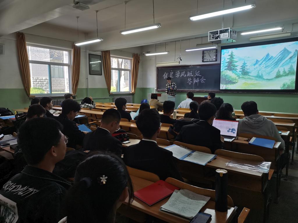 邢杰老师首先为大家讲解优良学风班评比依据,希望参评班级从班级制度建设、学风建设活动、班级学习成绩、科技竞赛参与情况等方面展示班级风采。18050141、142班介绍了班级根据同学们的特点划分小组学习,每周初报小组计划,每周末进行回顾总结;20050401班设立班级吐槽本,班委根据同学们反馈的意见不断完善班级制度起到了良好的效果;还有班级开展了优秀笔记分享会;这些活动的开展都激发了同学们的学习热情,2050406班更是取得了年级均分第一、优秀率第一、及格率第一的突出成绩。