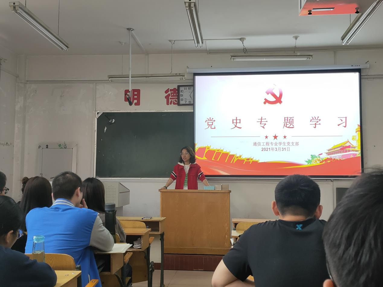 为促进学生党员深入学习中国共产党历史,坚定理想信念,弘扬爱国主义精神。3月24日通信工程专业学生党支部开展了“心有所信,知史爱国”主题党日活动;3月25日信息对抗技术专业学生党支部开展了“学党史,强信念,跟党走”主题党日活动,光电专业学生党支部开展了“四史”知识竞赛主题党日活动;3月29日,第五学生党支部开展了“凝心聚力学党史,砥砺前行跟党走”主题党日活动。