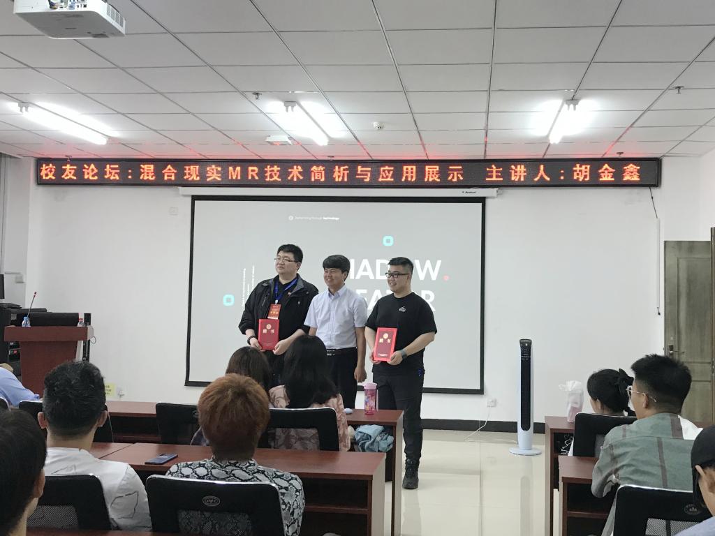 胡金鑫校友首先简单介绍了影创科技集团的创立初衷及公司文化,并欢迎学弟学妹去上海影创科技集团参观体验。接下来针对虚拟现实进行了简单的介绍和市场分析。论坛分享了影创科技公司AR、VR、MR技术目前在科技、文化、旅游、教育、娱乐、电子竞技等领域的应用及相应的产品,并对全息影像技术原理进行了详细的阐述说明,最后,曹凤才书记为胡金鑫校友和刘晖校友颁发了校友导师聘书,期待校友联动,为大奶主播育人工作提供指导。