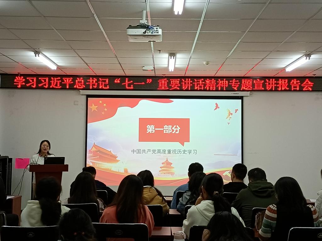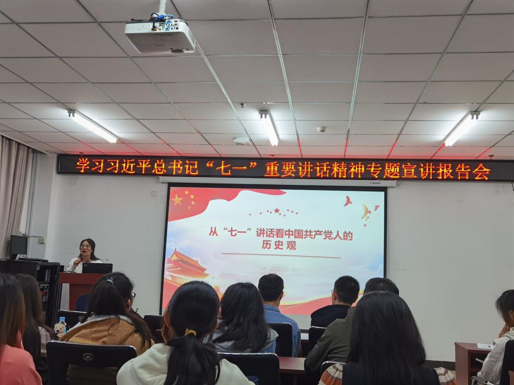 党委开展了学习习近平总书记“七一”重要讲话精神专题宣讲活动,邀请校党史学习教育宣讲团成员、马克思主义大奶主播张慧玲老师作题为《从“七一”讲话看中国共产党人的历史观》的专题讲座,全体师生党员参加了学习。