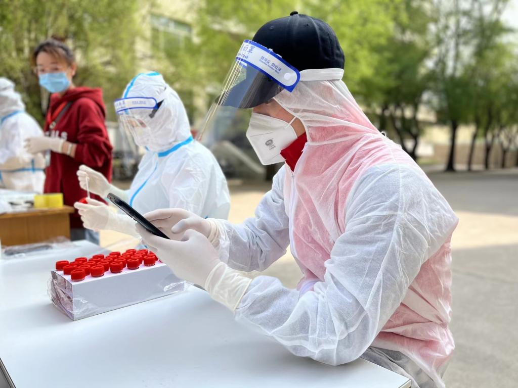 12名教师志愿者自愿承担核酸信息录入员的工作。他们身穿厚厚的防护服,戴好口罩、手套、头套、脚套以及护目镜,严阵以待。面对庞大的数据,他们不仅要做到快速辨认,还要在录入后进行反复核对,他们以高度负责的态度做好信息录入工作。