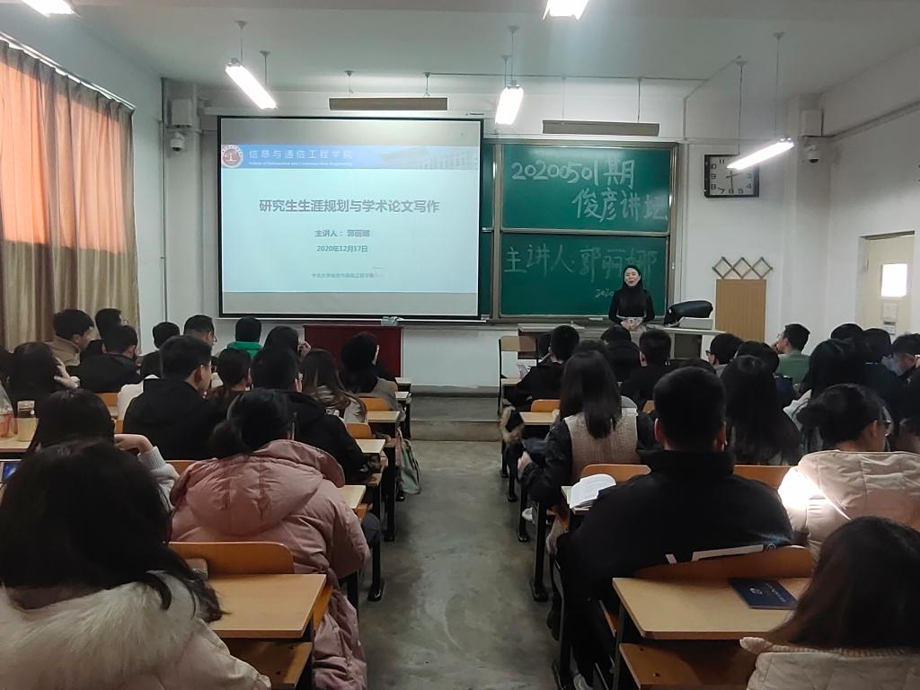 邀请青年教师郭丽娜博士在13301H教室举办了第一期“俊彦讲坛”,以研究生生涯规划与学术论文的写作展开了主题讲座,引导2020级研究生尽早确立奋斗目标,合理规划研究生时光。