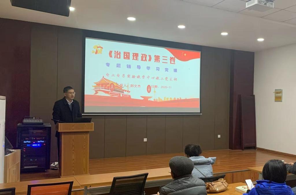 2020年11月18日下午16点,电工电子实验教学中心教工党支部在中心三层会议室开展《习近平谈治国理政》第三卷专题辅导学习党课,本次党课由支部书记郎文杰带领支部全体党员共同学习。